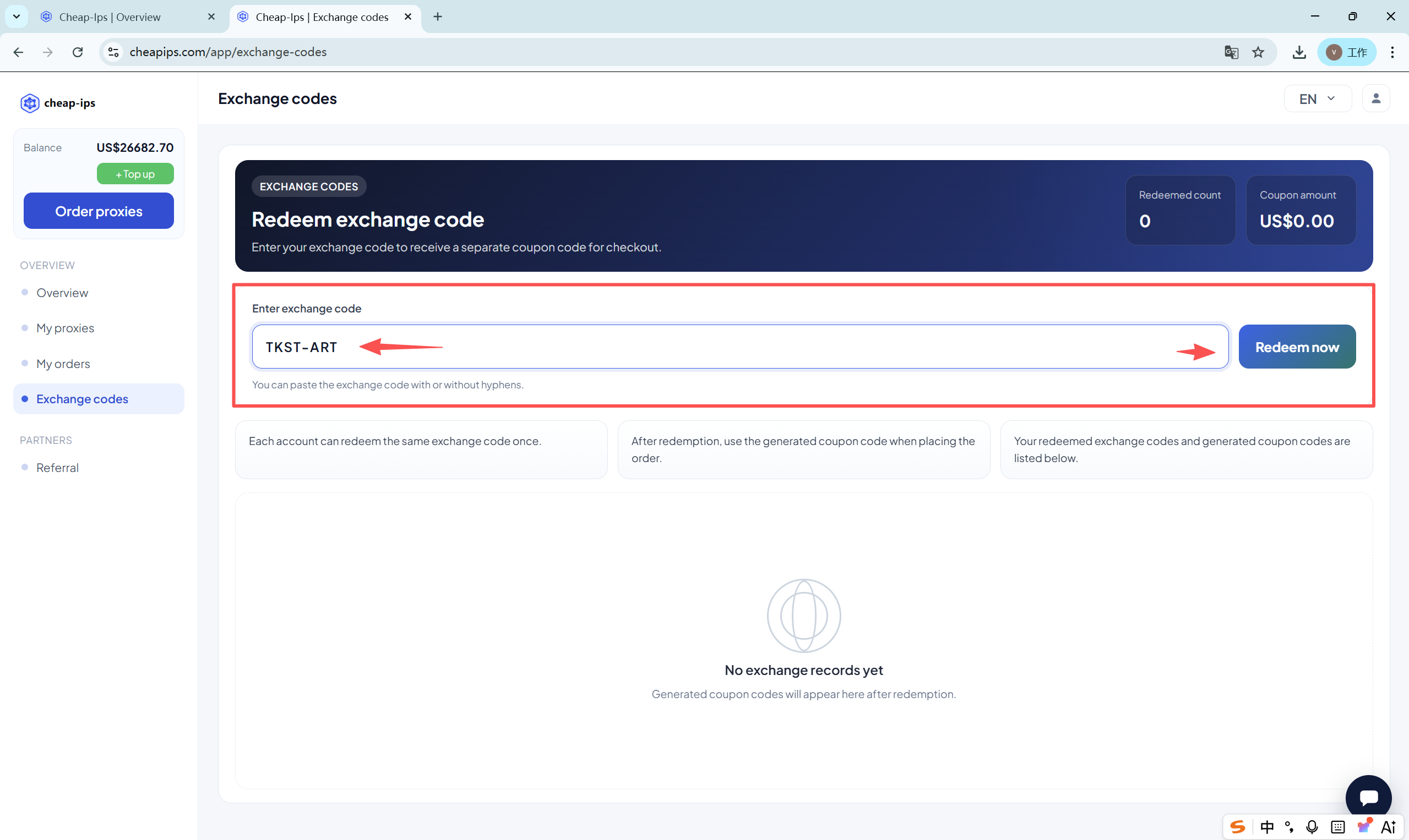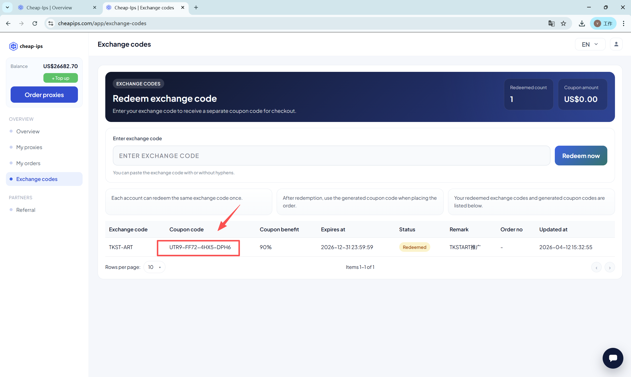 复制生成出来的兑换码:
